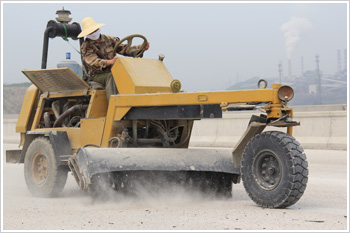 噴涂橋面防水涂料前,首先鑿除混凝土浮漿,平整凸凹不平處,清除油污,垃圾等,然后徹底清掃基面,再用吹塵器把基面吹干凈